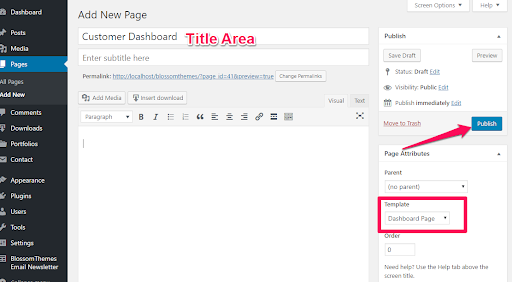 - Enter the Title & Select the Page Template as Dashboard Page